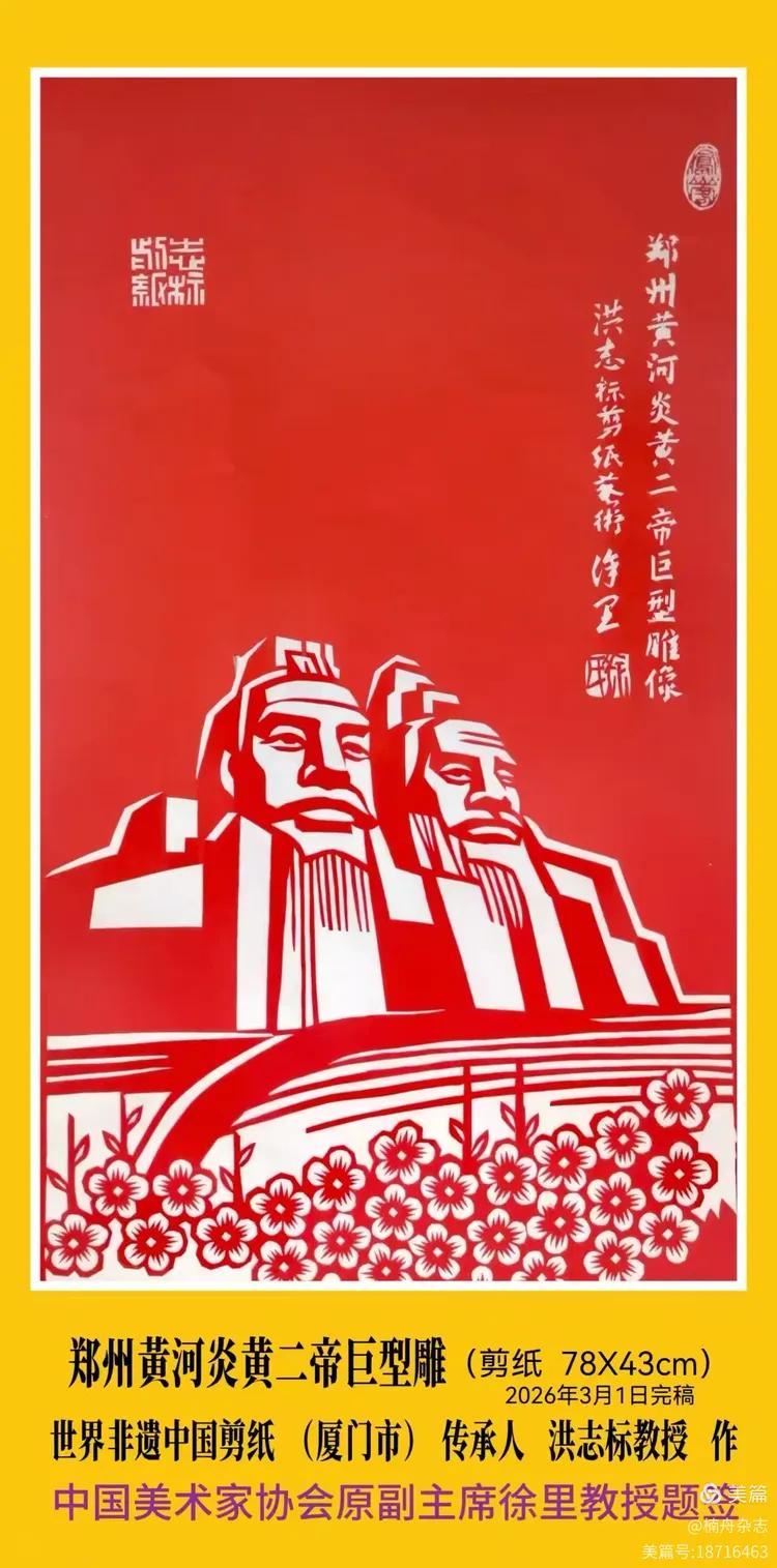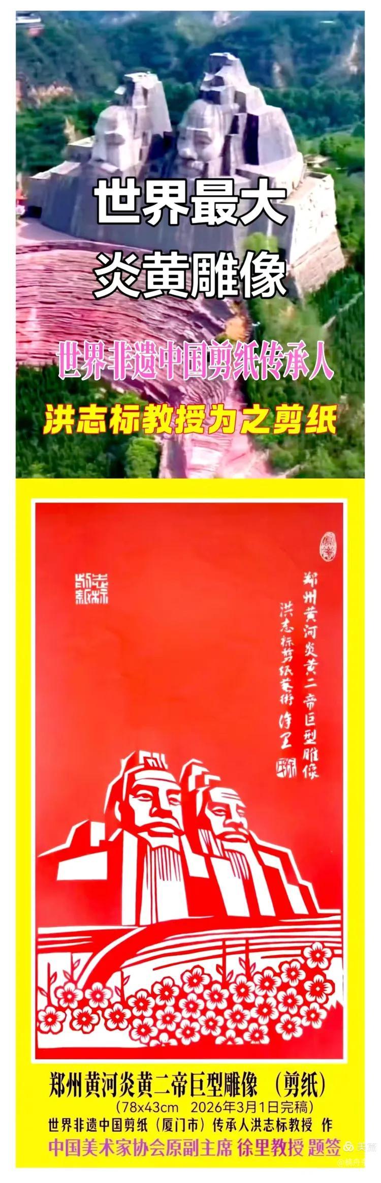 礼赞!中国当代艺术家协会名誉主席、香港群贤毕至书画院名誉院长、澳门《环球华商报》永远荣誉社长,世界非遗中国剪纸传承人,世界华商精英联合总会荣誉会长兼书画分会会长洪志标教授金马新岁为世界最大炎黃雕像创作剪纸艺术作品并组稿重任。
