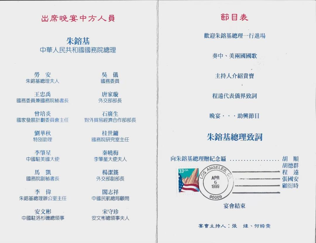 朱鎔基總理於1999年4月6~14日, 對美國進行了正式訪問。先後訪問了洛杉磯、華盛頓、丹佛、芝加哥、紐約和波士頓等6個城市。朱總理在中國加入世貿組織 (WTO) 談判的關鍵時刻訪問美國,是中美關係中的一件大事。朱總理的博學、率直、幽默在美國民眾中引起了強烈反響。朱鎔基總理破冰之旅訪美行程, 所到之處刮起了「朱旋風」。朱總理對美國的訪問取得了圓滿成功,增進了兩國人民之間的了解和友誼,為中美兩國關係的健康發展譜寫了新的篇章。以下是在南加州各界華僑華人➤歡迎朱鎔基總理和夫人宴會➤共同出席節目表的介紹和大家分享。