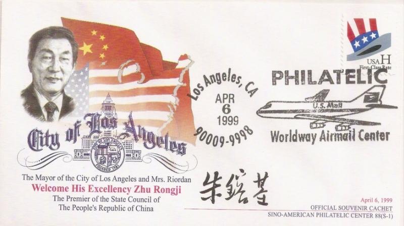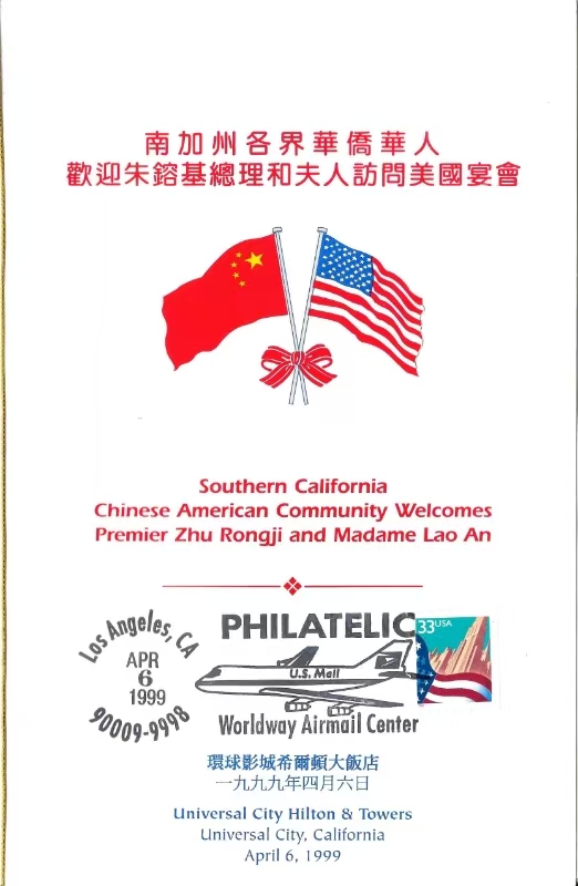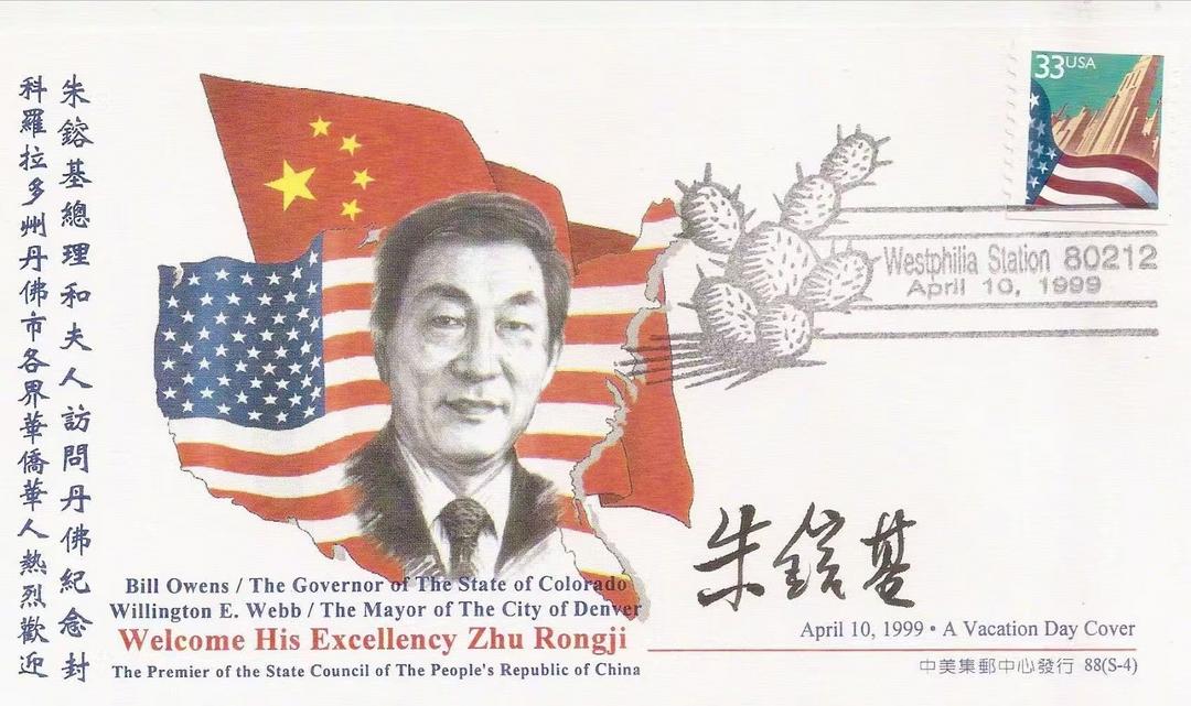 (4)➤ 1999年4月10日离开华盛顿,朱镕基总理前往中西部的丹佛市 (Denver) 访问。午宴由丹佛市长韦布 (Willington E. Webb) 主持,推动昆明市与丹佛结为姐妹城市关系。晚宴由科罗拉多州州长欧文斯 (Bill Owens) 和西部州长协会共同主办。推动美国科州与中国湖南省结为姊妹州省仪式。朱总理还表示,作为一个湖南人,他非常高兴地看到科罗拉多州和湖南省结成友好州省关系。他此次访问美国就是为了加深两国人民之间的了解和理解,推动中美两国友好合作关系的进一步发展。 在美国旅游胜地丹佛市期间,东道主安排了丰富多彩的节目,特别值得一提是,朱总理称当天是一个 Vacation day;故此在纪念封右下角处,也幽默风趣注为 A Vacation Day Cover. (首日封的英文称为 Cover / 序号 88. S-4) 。