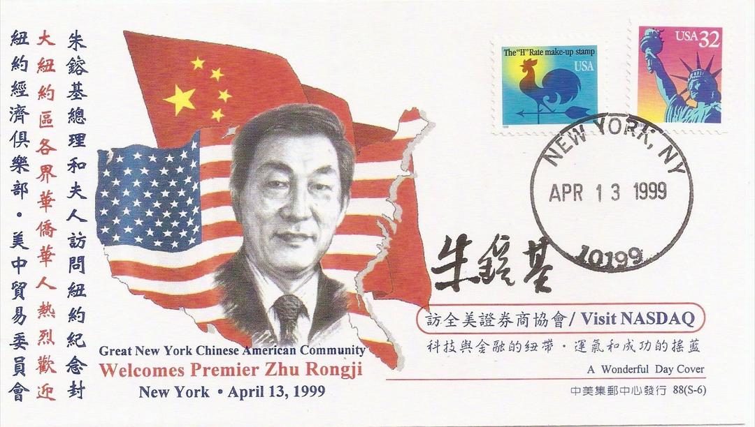 (6)➤4月13日,在纽约纳斯达克股票交易所 (NASDAQ) 进行按钮仪式。出席由纽约经济俱乐部主席威廉. 麦克多诺 (William J. McDonough, The Economic Club of New York) 和美中贸易协会举办的欢迎宴会,规模盛大,有1,500人参加,主办单位对朱总理说,有位中国女记者建议这天叫做“Wonderful day”; 此封也幽默风趣称为 A Wonderful Day Cover. (序号 88. S-6)。