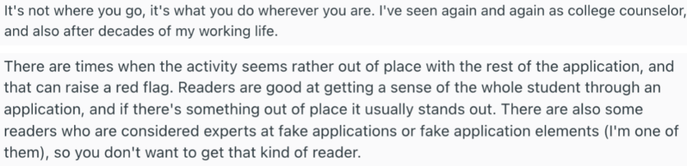 他还透露了一个招生内幕,大学招生官团队中有专门识别包装型的虚假申请专家,很多看似精巧的曲线救国路径,其实一眼就能识破。