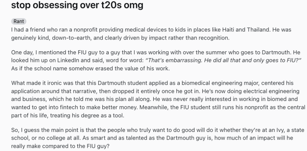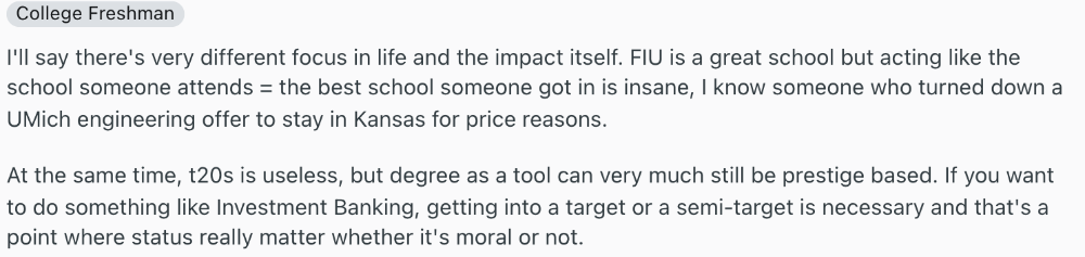 但与此同时,他也承认一个残酷现实,T20大学学位确实能提高进入投资银行、公司法等精英领域的成功率。FIU本身不丢人,但在这些行业「出身不高」确实是硬伤。