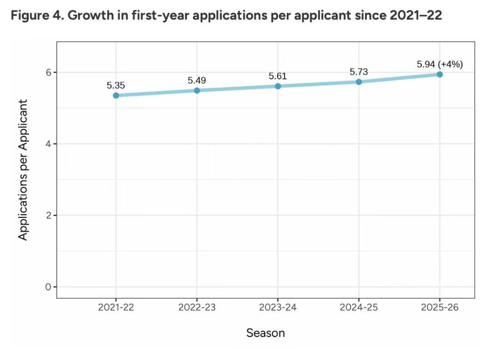但回看如今美本申请的焦虑,大家把个位数的录取率当作攻克目标,全球人均申请院校数冲到了5.94所,中国学生每年向十多所院校发去申请已是常态。