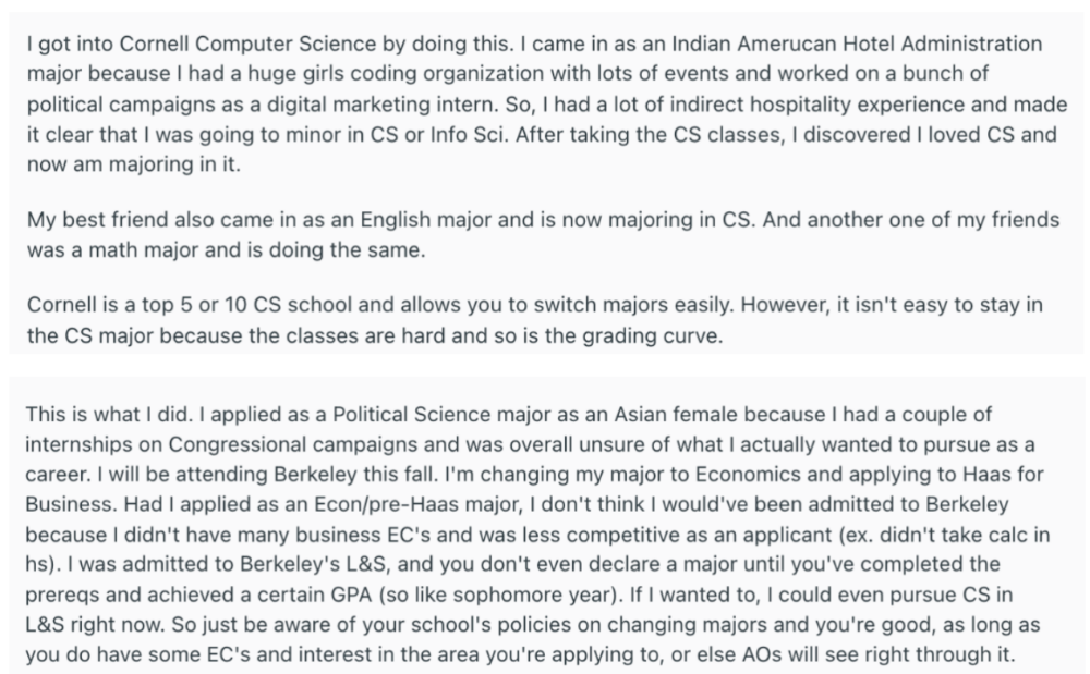 现在灵活转专业已经成了美本录取的漏洞,无数人先申一个竞争没那么激烈、亚裔少的专业,进校后再转CS、工程、商科等热门、好就业的专业。