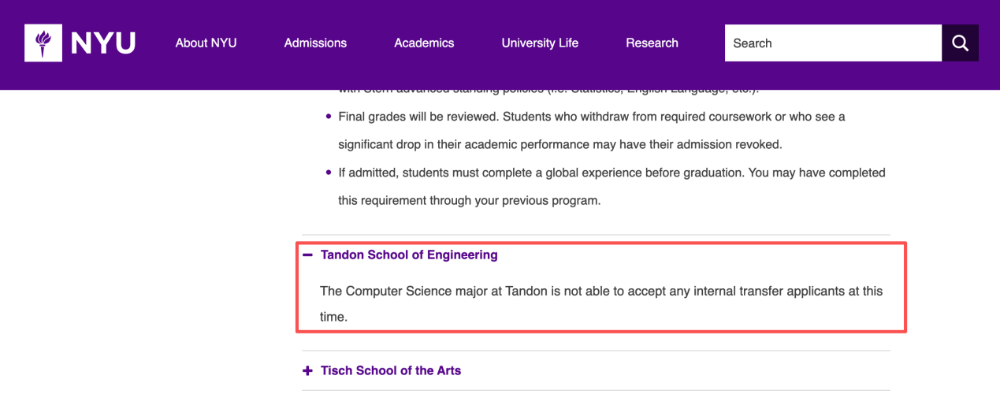 比如国际生最多的纽约大学,工程学院完全不接受转专业,艺术学院的要求也形同虚设;工程学院应用数学专业的学生不能申请转入文理学院的数学、计算机科学与数学、数据科学与数学或经济学与数学专业。
