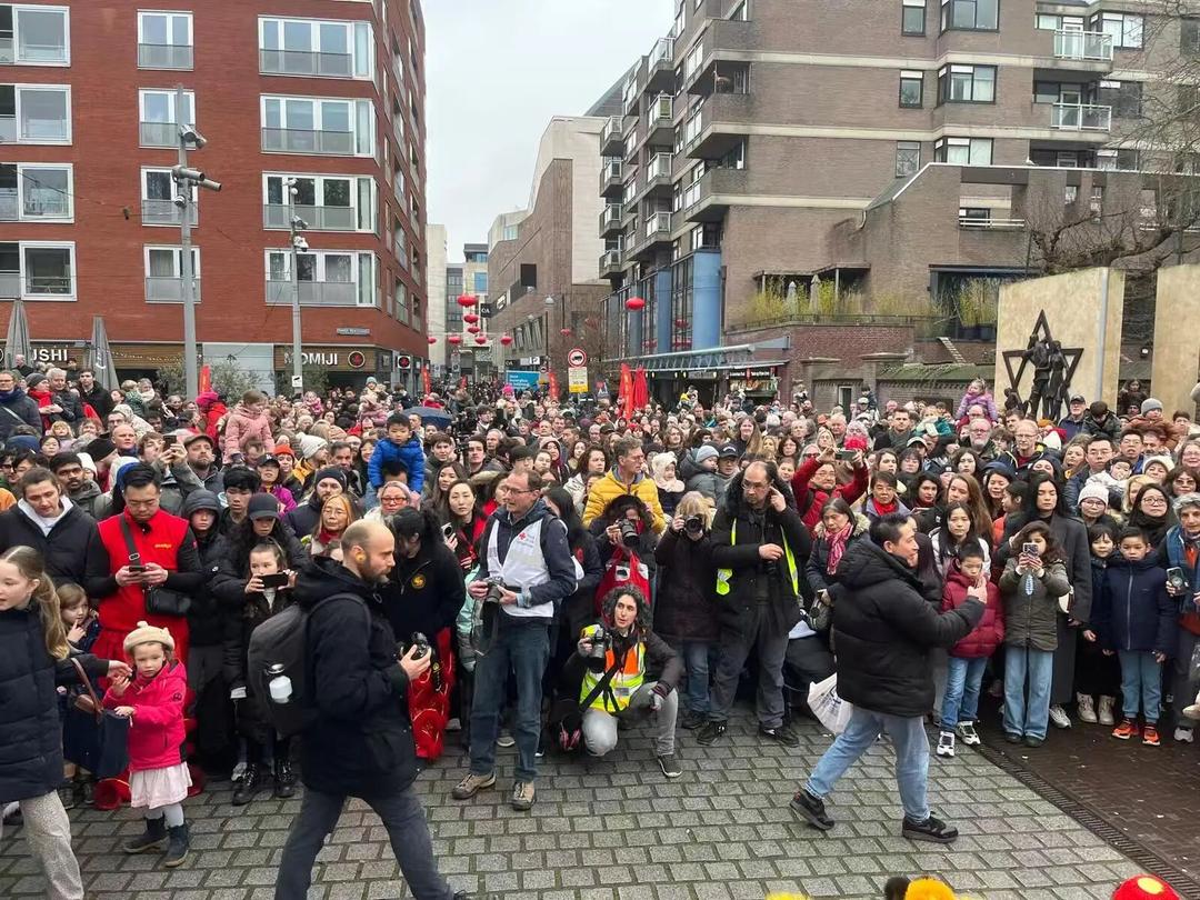 而据NOS报道,成千上万的人涌入海牙唐人街及周边区域观看舞龙巡游。现场人山人海,许多观众提前数小时到场,只为占据最佳观赏位置。孩子们骑在父母肩头挥舞小旗,手机镜头此起彼伏,记录下金龙腾空、鼓点震天的瞬间。整条街道几乎被观众围得水泄不通,节日氛围堪比大型城市庆典。